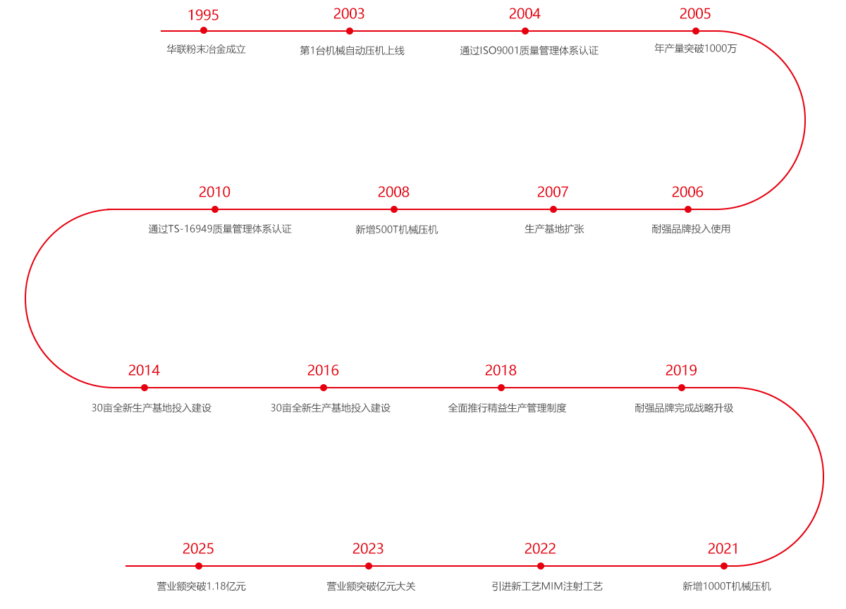 25年砥砺发展,华联正带着“拼搏”的标签一步一步茁壮成长。每一个阶段都是一个新的起点,我们将不断“拼搏”进取,争取成为粉末冶金行业的“标杆”企业。